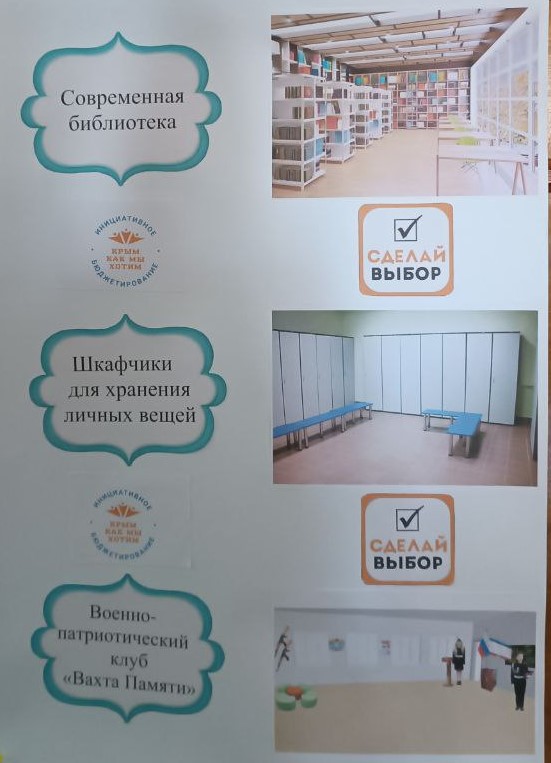 В текущем году ребята подготовили три проекта: «Современная библиотека», «Шкафчики для хранения личных вещей» и «Военно-патриотический клуб «Вахта Памяти».